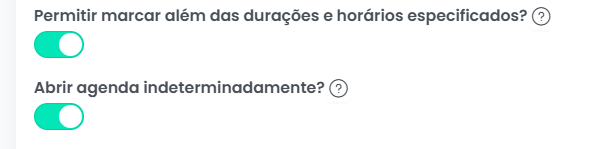 - Permitir marcar além das durações e horários especificados?: Habilite essa opção se desejar ter flexibilidade para agendar horários fora dos turnos definidos, ou com duração diferente daquelas que você marcou.