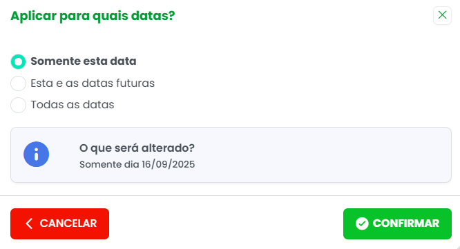 - Somente esta data: A alteração será aplicada apenas ao dia selecionado (neste caso, 16/09/2025).