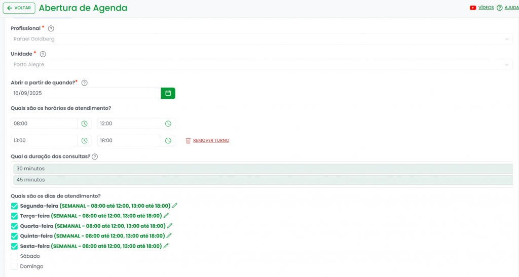 - Abrir agenda indeterminadamente?: Mantenha essa opção ligada se a agenda do profissional não tiver uma data de término. Se você desativá-la, será necessário definir uma data de encerramento para a agenda.