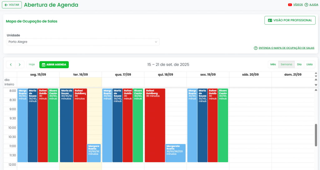 - Horários e Profissionais: A visualização mostra os horários na vertical e os dias da semana na horizontal. Cada bloco colorido representa um turno de atendimento de um profissional em uma sala.