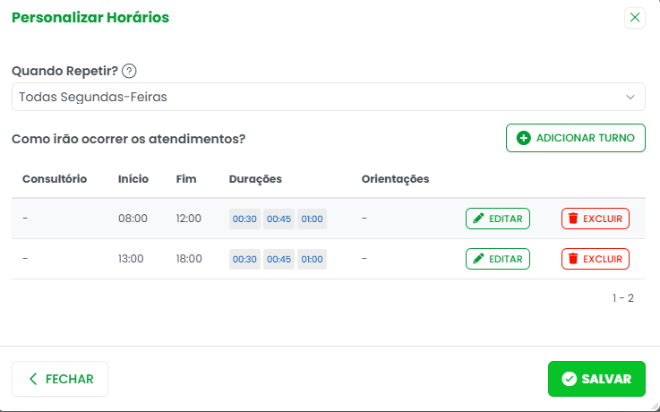 - Para editar um turno existente, clique em “EDITAR”. Para removê-lo, use o botão “EXCLUIR”.