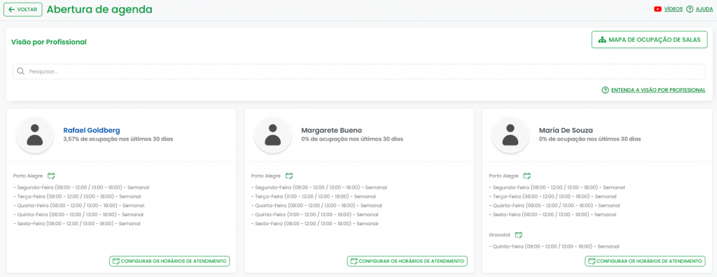 Na sua tela principal do Prontuário Verde, localize “Abertura de agenda” no menu Configurações => Agenda. Você será direcionado para uma página com a visão geral dos profissionais da sua clínica, onde terá uma lista de todos os profissionais de saúde cadastrados para aquela unidade. Cada cartão de profissional exibe informações como nome, porcentagem de ocupação nos últimos 30 dias e, se já configurado, os horários de atendimento.