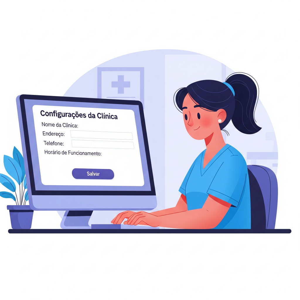 Para personalizar as informações gerais da sua clínica, como nome, logotipo e dados de contato, siga os passos abaixo: